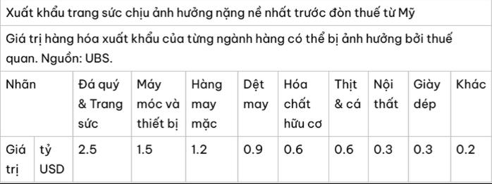 Ngân hàng UBS ước tính có khoảng 8 tỷ USD giá trị hàng hóa xuất khẩu, chủ yếu từ các ngành đá quý, trang sức, thủy sản, may mặc, dệt may và hóa chất, đang nằm trong vùng rủi ro cao trước đòn áp thuế mới.