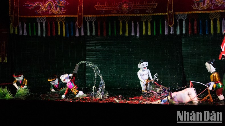 trong chiếc khố đỏ vừa ngâm thơ, vừa nhảy múa trên làn nước xanh rêu. Màn trình diễn thu hút người xem với những con rồng, phượng hoàng, và cả những người nông dân trong các hoạt động thường ngày.