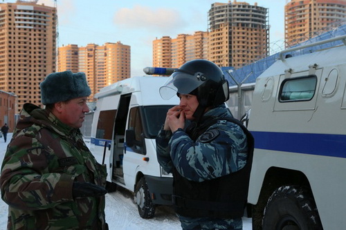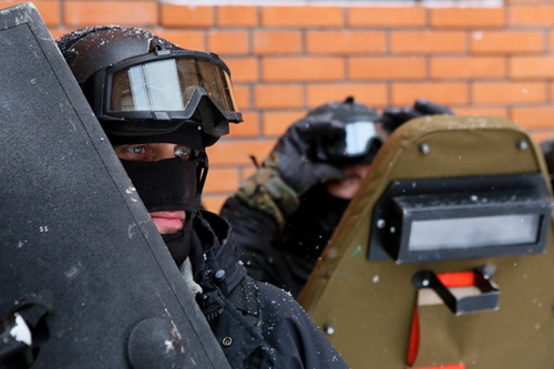Các chiến sĩ trực thuộc lực lượng cảnh sát đặc nhiệm Nga gồng mình huấn luyện trong điều kiện tuyết phủ trắng xóa khắp nơi.