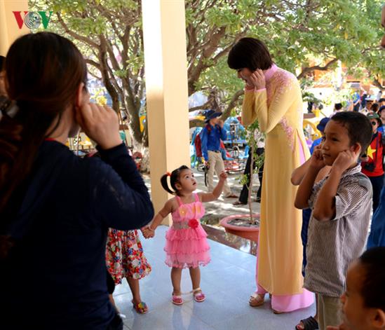 Chuyến ra thăm Trường Sa đúng vào dịp Tết thiếu nhi 1/6, Huyền dành nhiều thời gian chơi đùa bên lũ trẻ ngoài đảo.