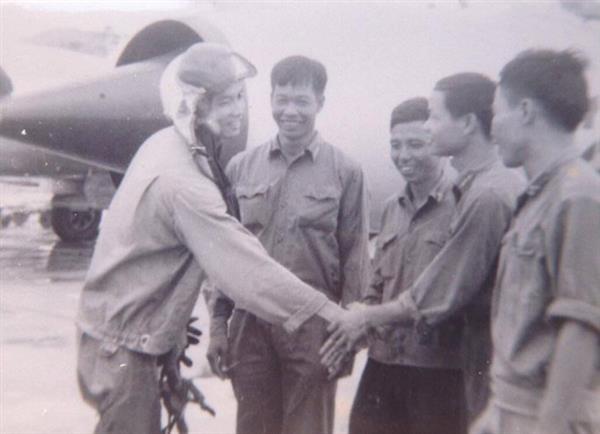 Phi công Nguyễn Văn Nghĩa (ngoài cùng bên trái) bắt tay đồng đội sau những ngày chiến đấu. (Ảnh tư liệu).