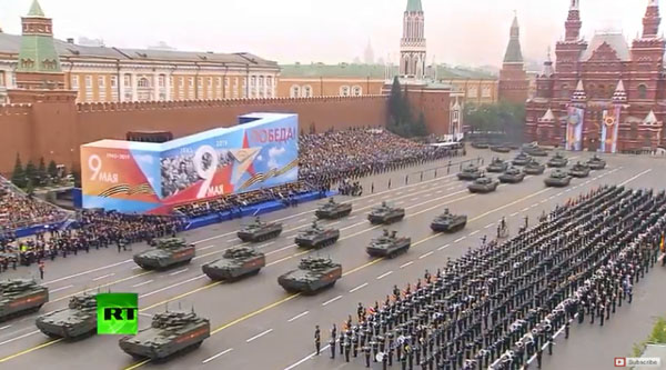 Các phương tiện tiến qua Quảng trường Đỏ trong lễ duyệt binh hôm nay. (Nguồn: RT).