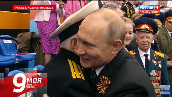 Tổng thống Putin ôm một cựu binh có mặt trên khán đài theo dõi lễ duyệt binh. (Nguồn: Russia 1).