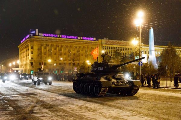 Tại Volgograd, quân đội Nga cũng tổ chức luyện tập diễu binh với khí tài, trong ảnh là xe tăng T-34-85. (Ảnh: Bộ Quốc phòng Nga)