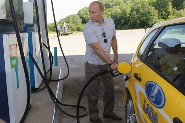Ông Putin, khi làm Thủ tướng Nga vào tháng 8/2010, tự bơm xăng khi lái xe ô tô tới công trường nhà máy thủy điện Nizhne-Bureyskaya.