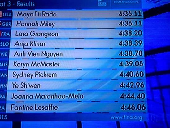 Tuy nhiên, thật đáng tiếc cho Ánh Viên, dù thi đấu ấn tượng như vậy, nhưng cô đã hụt chiếc vé vào thi đấu vòng chung kết một cách sít sao (chỉ kém 0,58 giây) khi thua kình ngư người Pháp, Lara Grangeon (xếp thứ 8 chung cuộc trong 8 kình ngư vào chung kết) có thành tích 4 phút 38 giây 20.