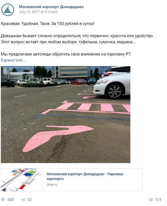 Metro đưa tin, sân bay Moscow, Nga, đã gây ra tranh cãi khi bố trí một bãi đậu xe dành riêng cho phụ nữ. Khu vực này được kẻ vạch màu hồng và có biểu tượng hình giày cao gót.