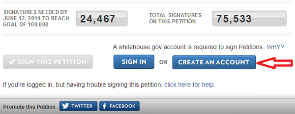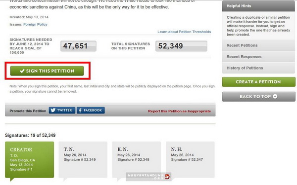 Sau khi bấm vào đường link kích hoạt, ta sẽ quay lại trang mạng của Nhà Trắng, vào đúng trang kiến nghị. Ở đây, ta bấm vào nút Sign this Petition (nút màu xanh lá) là xong.