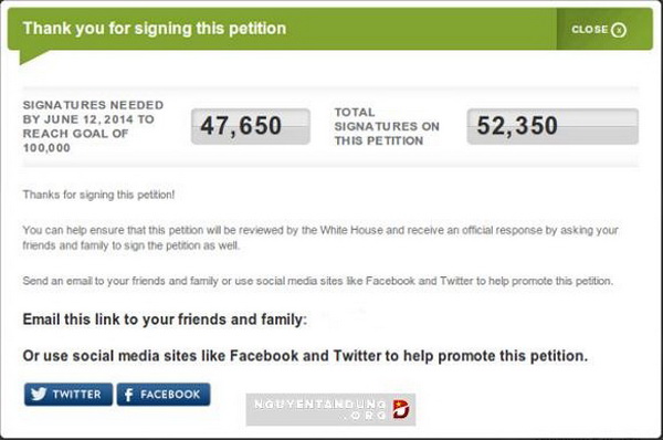 Sau khi đã ký tên, bạn sẽ nhận được một thông báo xác nhận bạn đã ký tên xong và nội dung cho phép bạn chia sẻ kiến nghị trên Facebook và Twitter để mời mọi người cùng ký tên ủng hộ.