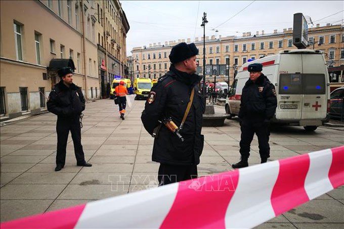 Cảnh sát gác tại Saint Petersburg, Nga. Ảnh: AFP/TTXVN