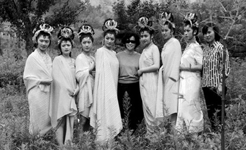 7 nữ diễn viên trẻ đóng vai yêu nhền nhện chụp hình kỷ niệm với đạo diễn Dương Khiết (đeo kính) và người phục trách phục trang.