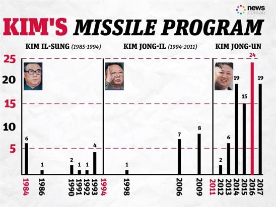 Theo News.com.au, nhà lãnh đạo Triều Tiên Kim Jong-un đã đặt dấu ấn rõ rệt sau 6 năm lên nắm quyền. Ông Kim phóng số lượng tên lửa nhiều hơn cả người cha Kim Jong-il và ông nội Kim Nhật Thành trong suốt quãng thời gian nắm quyền.