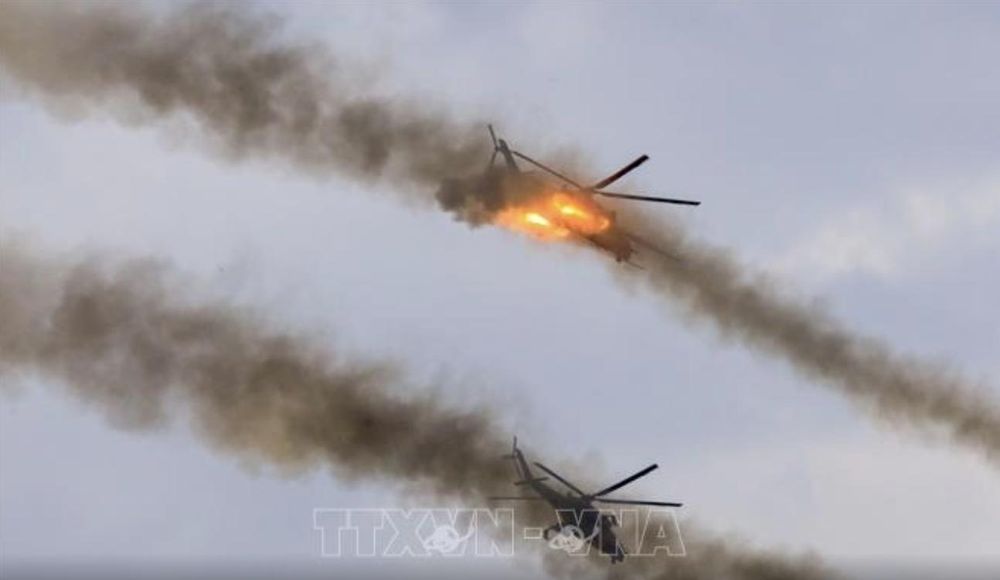 Các biên đội trực thăng chiến đấu hỗ trợ tiêu diệt mục tiêu trong khuôn khổ cuộc tập trận chiến lược chung Zapad-2021 của quân đội Liên bang Nga và Belarus, chiều 13/9/2021, tại thao trường Mulino ở tỉnh Nizhnyi Novgorod (cách Moskva 400km về phía Đông), Ảnh: Duy Trinh - PV TTXVN tại Nga