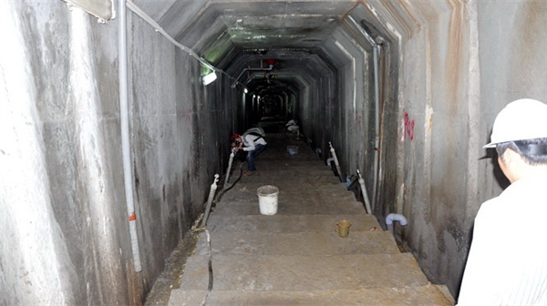 Bên trong đường hầm, các công nhân đang trám trét ximăng ở rãnh nước dọc hai bên tường. Một số công nhân khác tiến hành trám các lỗ hỏng hóc trên trần hầm. Một nhóm đang dọn vệ sinh hoàn thiện.
