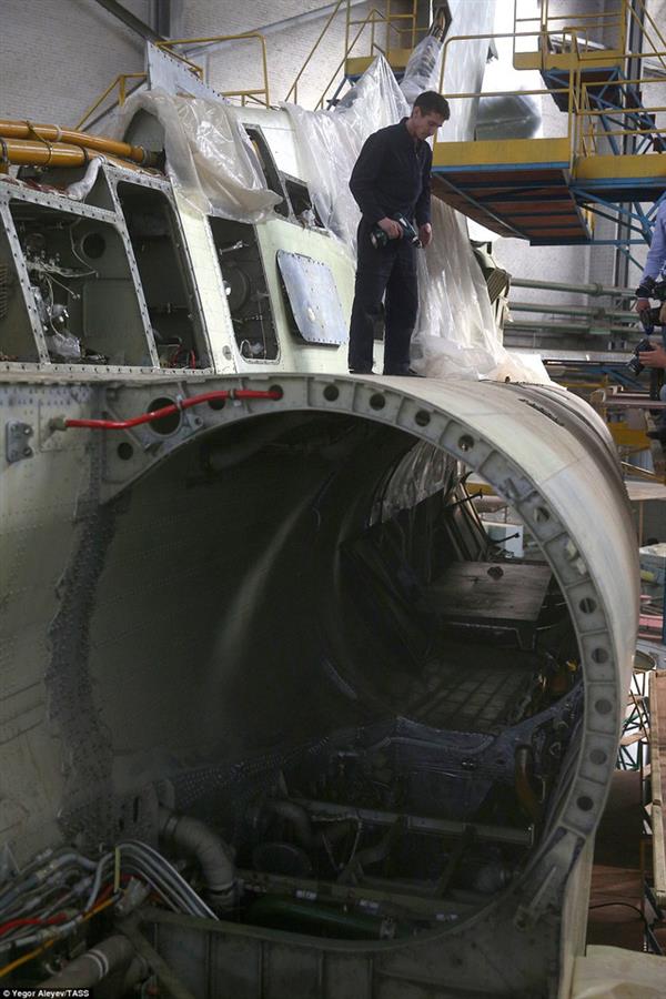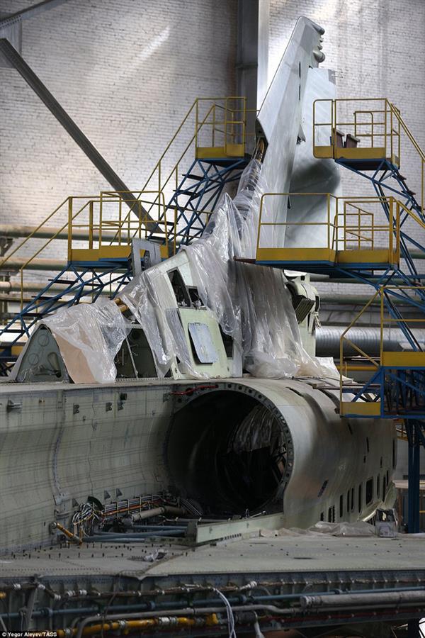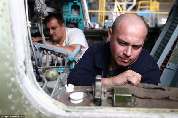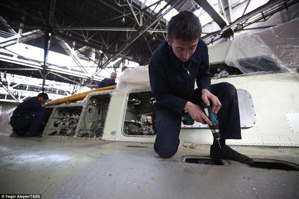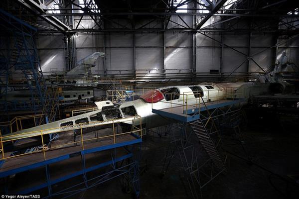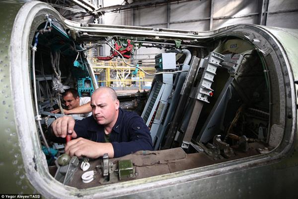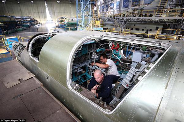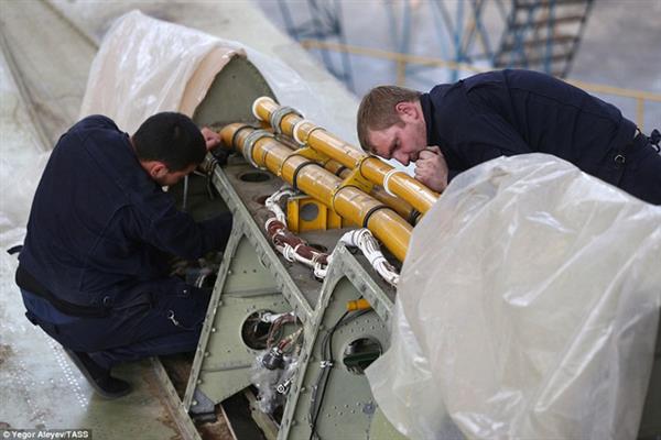 Các công nhân và kỹ sư kiểm tra tỉ mỉ quá trình lắp ráp các bộ phận trên máy bay Tu-22M3M mới.