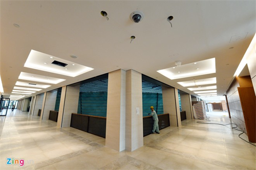 Tổng cộng có hơn 700 bộ cửa gỗ, các vách ngăn được sử dụng khung nhôm, vách kính mặt đứng, đóng tấm thạch cao và gia công tấm tường ốp gỗ với những mảng màu gần giống Trung tâm Hội nghị quốc gia Mỹ Đình.