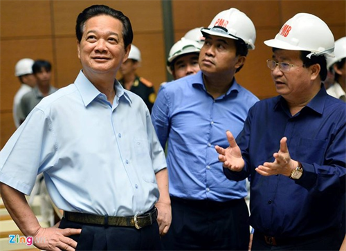 Chiều 3/10, Thủ tướng Nguyễn Tấn Dũng đã đi thị sát công trình. Theo Bộ trưởng Xây dựng Trịnh Đình Dũng (phải), trong những ngày này, ở đây luôn có tới 2.000 lao động gấp rút làm việc để hoàn thiện.