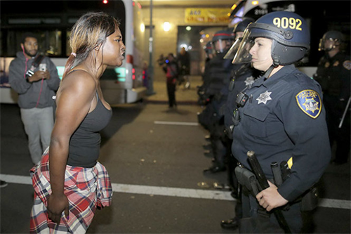 Một người biểu tình da màu phản ứng với nữ cảnh sát da trắng trong đêm biểu tình thứ hai ở Emeryville, California đêm 25 rạng sáng 26-11 - Ảnh: Reuters