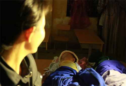 Chị Huỳnh Thị Diễm chăm sóc hai con nhỏ tránh bão đêm 29-11 tại Trường mẫu giáo Xuân Lâm, thị xã Sông Cầu - Ảnh: Tiến Thành