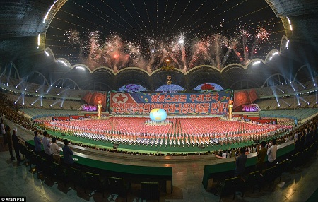 Pháo hoa thắp sáng bầu trời Triều Tiên trong lễ khai mạc hội đồng diễn Arirang năm 2013.