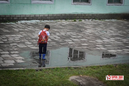 Một cậu bé tha thẩn chơi bên vũng nước mưa trên đường đi học về.