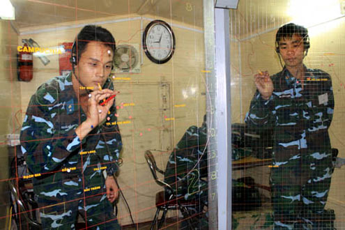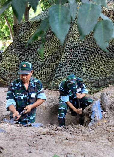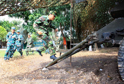 Cuộc diễn tập nhằm đánh giá khả năng sẵn sàng chiến đấu, trình độ chỉ huy hiệp đồng của các cơ quan trong đánh địch tiến công hỏa lực đường không. Trong ảnh, các chiến sĩ triển khai đào công sự.