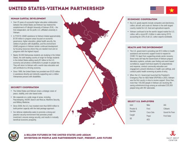 Trước đó, trong bài viết nhìn lại 25 năm quan hệ đối tác Việt Nam - Mỹ trên trang Facebook chính thức của Đại sứ quán Mỹ tại Việt Nam ngày 9/9 sử dụng hình ảnh bản đồ Việt Nam bao gồm quần đảo Hoàng Sa và Trường Sa. Tuy nhiên, đến ngày 15/9, hình ảnh này đã bị thay đổi.