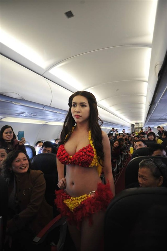 Trong loạt ảnh chia sẻ trên facebook, có những hình ảnh rất sexy với bộ bikini kết từ hoa hồng, khéo léo để lộ vòng 1 căng đầy. Màn trình diễn bất ngờ này của các cô gái đã khiến hành khách tỏ vẻ hứng thú, còn dùng các thiết bị kỹ thuật số như điện thoại, máy tính bảng để lưu lại.