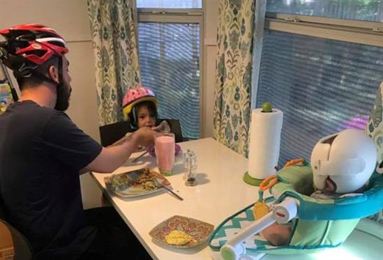Cả gia đình đội mũ bảo hiểm ăn cơm