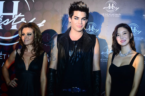 Adam Lambert bên cạnh hai bạn diễn trong đêm nhạc là biểu tượng âm nhạc Bồ Đào Nha - Aurea (trái) và ngôi sao Hàn Quốc NS Yoon G.