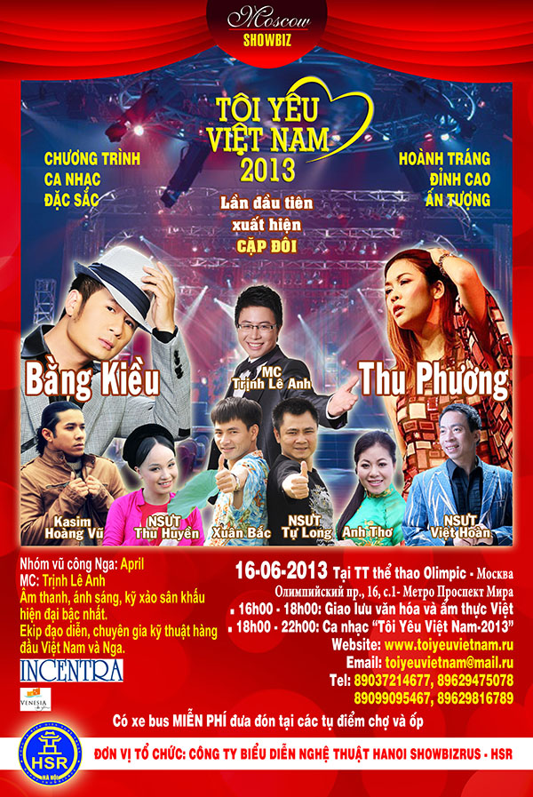 Chúng ta hãy đón xem và hưởng ứng tình cảm của Bằng kiều - Thu Phương cùng các ca sĩ nổi tiếng Anh Thơ, Việt Hoàn, Thu Huyền , Kasim Hoàng Vũ và cặp danh hài Xuân Bắc –Tự Long dành cho cộng đồng chúng ta trong chương trình ca nhạc “Tôi Yêu Việt Nam- 2013” tại Cung Thể thao đa chức năng Olimpic – Matxcova bắt đầu từ 16h00 ngày 16.06.2013.