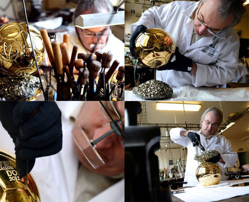 "Hai chiếc đĩa bằng đồng được hàn lại với nhau để làm đế của ‘FIFA Ballon d'Or’. Chiếc đế sau đó được trang trí bằng những viên kim cương và ngọc bích. Điều đặc biệt mỗi viên kim cương, ngọc bích có hình dáng, màu sắc hoàn toàn khác nhau. Quả bóng làm bằng đồng thau, khắc tên của giải thưởng sau đó được nhúng vàng và gắn lên đế ", ông Francois giải thích về các công đoạn chế tác "FIFA Ballon d'Or".
