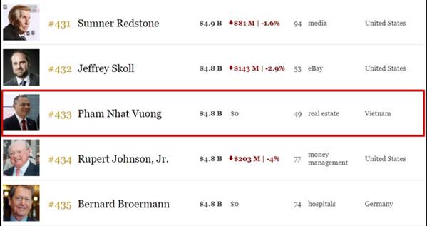 Thống kê của Forbes cũng nhanh chóng cập nhật tài sản của vị tỷ phú Việt Nam này, theo đó, tổng tài sản ròng của ông Vượng hiện chỉ còn 4,8 tỷ USD, giảm 800 triệu USD so với cuối tháng 1. Đà giảm này chắc chắn có phần rất lớn từ đà giảm của cổ phiếu VIC gần đây.