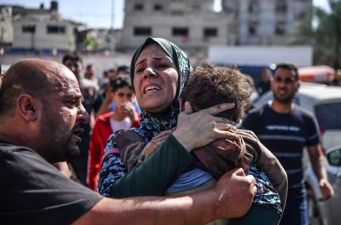 Một người phụ nữ ôm cậu con trai 3 tuổi thiệt mạng sau cuộc không kích xuống thành phố Gaza ngày 26/10. (Ảnh: Getty).