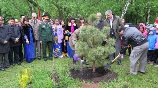 Sau khi kính cẩn dâng lên Bác những lẵng hoa và những đóa cẩm chướng đỏ, tươi thắm, các cháu thiếu nhi trường phổ thông 282 và toàn thể các đại biểu cùng hát vang bài “Như có Bác trong ngày Đại thắng”, rồi sau đó lại quây quần về bên cây thông mà Chủ tịch nước Trương Tấn Sang vừa trồng lưu niệm trong dịp sang Nga tham dự các hoạt động kỷ niệm tròn 70 năm Chiến thắng của nhân dân Nga trong cuộc Chiến tranh Vệ Quốc Vĩ đại. Đại sứ Nguyễn Thanh Sơn đã vun lại gốc cây và tưới nước rồi cùng trò chuyện với các vị đại biểu tham dự hoạt động đầy ý nghĩa này.