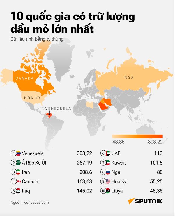 Hãy làm quen với đồ họa thông tin của Sputnik cho thấy bảng xếp hạng toàn cầu của các quốc gia theo trữ lượng dầu mỏ đã được chứng minh!