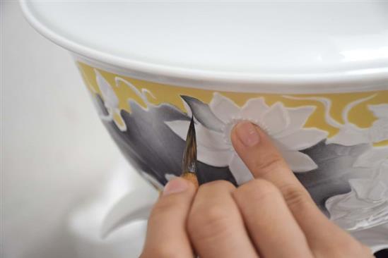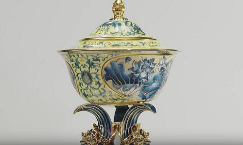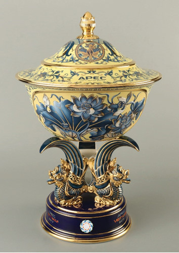 Họa tiết chủ đạo để trang trí chén ngọc APEC là hoa sen bình dị, kết hợp cùng dương xỉ và vàng 24k. Ảnh: Zing.