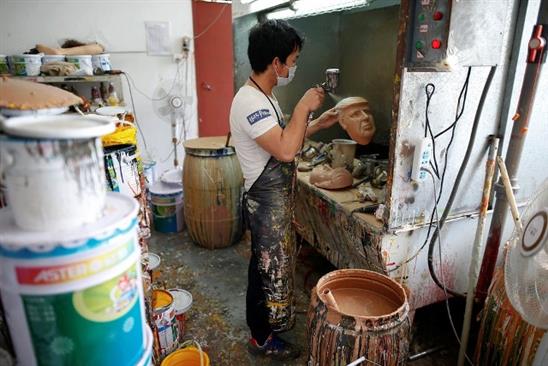 Một công nhân đang phủ sơn lên mặt nạ.