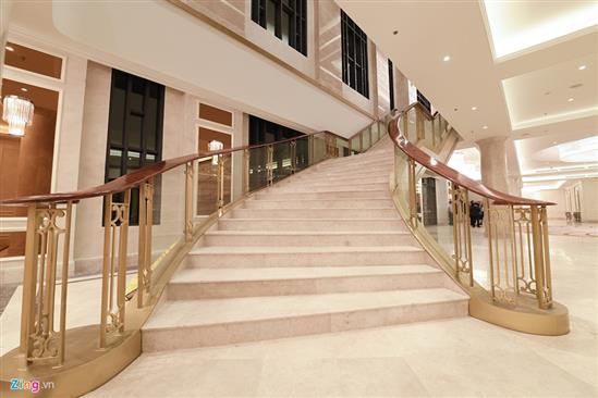 Hai bên đại sảnh là 2 cầu thang lớn dẫn lên tầng 2, nơi diễn ra quốc yến chiêu đãi 21 nhà lãnh đạo.
