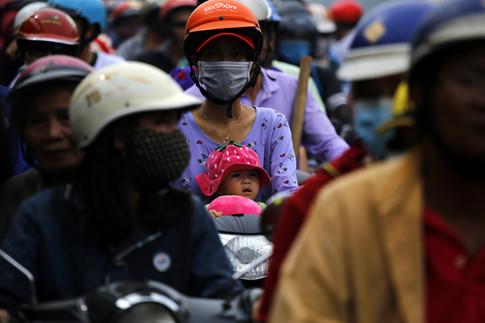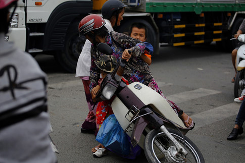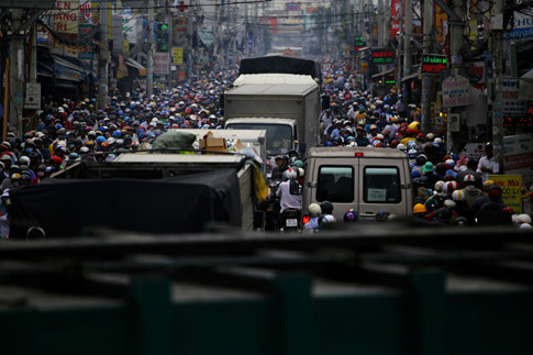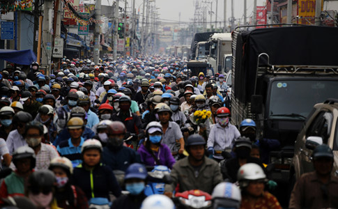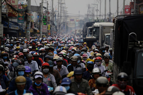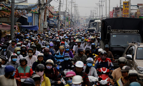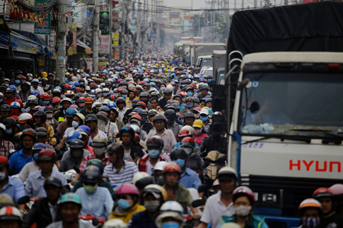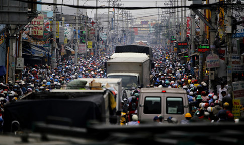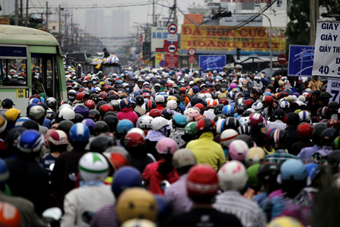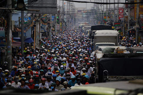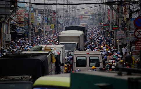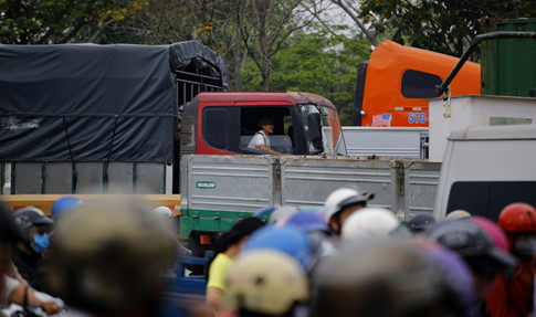 Xe tải xe máy chen chúc nhau