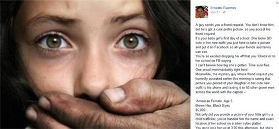 Ngày 21/5, một Facebook của người nước ngoài tên Ernesto Fuentes đăng bài viết cảnh báo một vụ bắt cóc và bán bé gái 5 tuổi người Mỹ với giá 5.000 USD cho một kẻ mắc chứng ấu dâm (thích quan hệ tình dục với trẻ em) khiến nhiều người giật mình.
