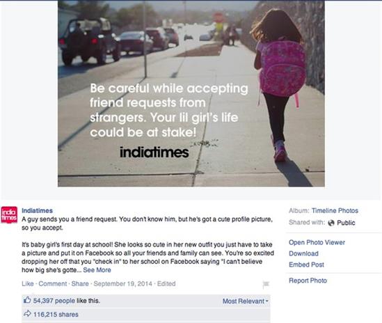 "Bạn không chỉ cung cấp hình ảnh cô bé của bạn cho một kẻ buôn trẻ em, bạn còn đưa cho hắn tên và vị trí chính xác nơi con bé học" - Facebook này nhấn mạnh sự nguy hiểm khi đăng tải thông tin và hình ảnh trẻ con lên mạng xã hội.