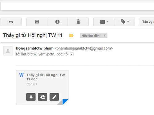 Thông tin cho biết các e-mail này được gửi từ địa chỉ thuhuyenvpcp@gmail.com với tiêu đề “Thông báo kết luận của Thủ tướng Nguyễn Tấn Dũng tại cuộc họp 03.6 về Luật ĐƯQT” và địa chỉ phamhongsambtctw@gmail.com, tiêu đề “Thấy gì từ Hội nghị TW 11”.