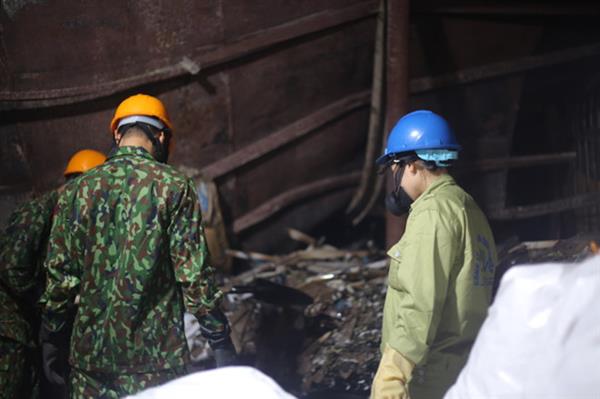 Bên trong các kho chứa, không khí rất ngột ngạt nhưng hàng trăm công nhân, chiến sĩ vẫn tích cực thu dọn các phếthải sau cháy