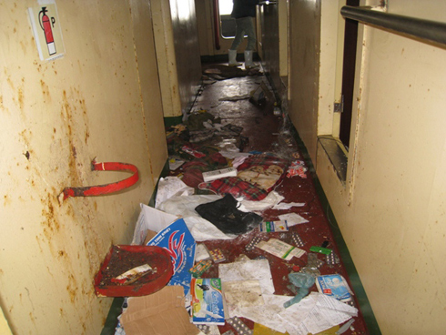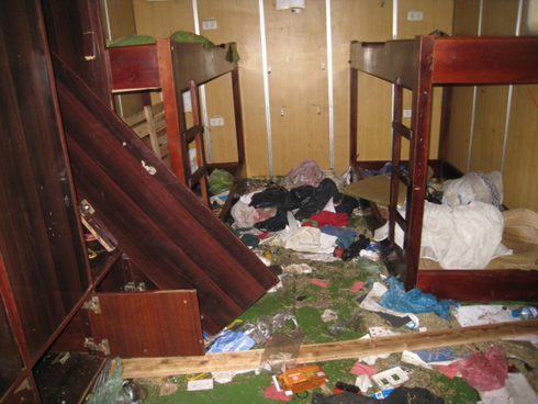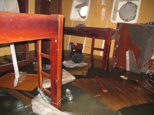 Bên trong phòng ngủ của thủy thủ đoàn, nhiều chiếc tủ và bàn ghế như bị lục tung, phá hỏng.
