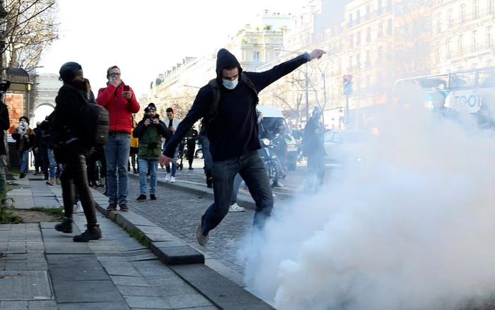 Một người biểu tình đá lựu đạn hơi cay của cảnh sát chống bạo động Pháp trên đại lộ Champs Elysees ở Paris. Ảnh: AP.