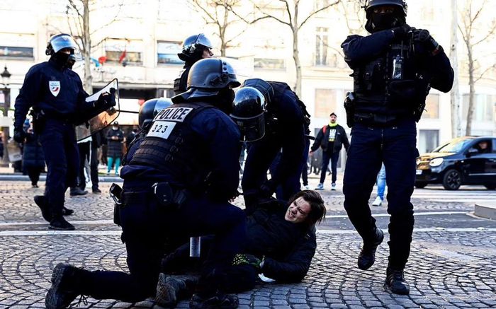 Một người đàn ông bị bắt giữ trên đại lộ Champs Elysees ở Paris vào ngày 12/2. Ảnh: AFP.
