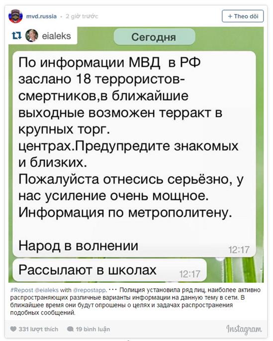(Thông tin được lan truyền từ nguồn Instagram: "Theo thông tin từ Bộ nội vụ Nga, 18 tên khủng bố sẽ tiến hành đánh bom ở các khu trung tâm thương mại lớn vào ngày nghỉ sắp tới. Hãy cảnh báo đến những người quen và bạn bè...)