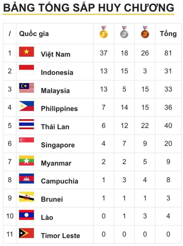 Cập nhật mới nhất bảng xếp hạng huy chương SEA Games 31, bảng tổng sắp huy chương SEA Games 31. Đoàn Việt Nam giành bao nhiêu huy chương vàng SEA Games 31?