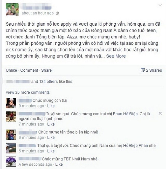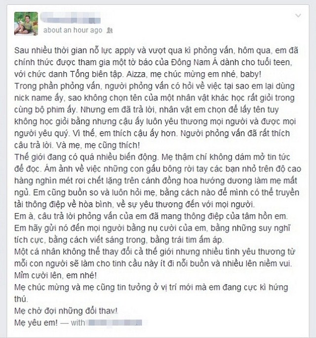 "Sau nhiều thời gian nỗ lực apply và vượt qua kì phỏng vấn, hôm qua, em đã chính thức được tham gia một tờ báo của Đông Nam Á dành cho tuổi teen, với chức danh Tổng biên tập. Aizza, mẹ chúc mừng em nhé, baby!